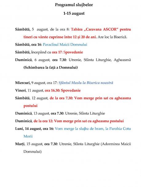 Luni, 14 august, ora 16: Vom merge la slujba de hram, la Parohia Cotu Morii